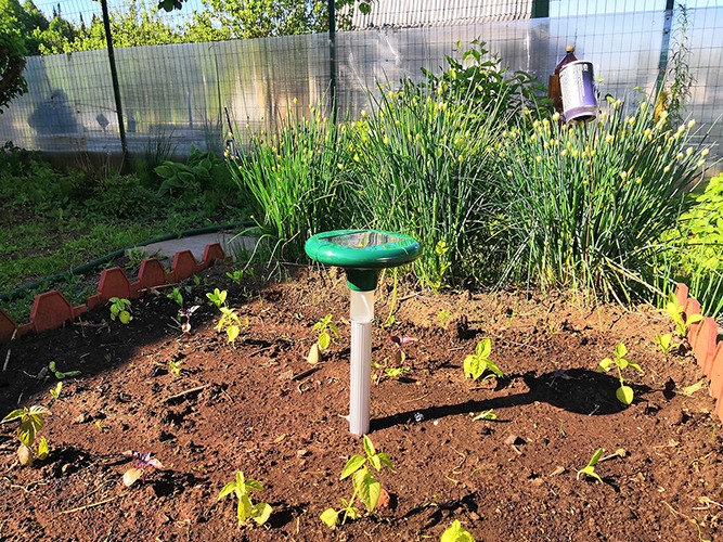 - Солнечная панель в верхней части отпугивателя обеспечивает абсолютно автономную работу прибора. Она имеет высокую чувствительность и всего за один яркий солнечный день заряжает аккумулятор настолько, что его заряда хватит для работы устройства в последующие 4 дня, даже если погода будет пасмурной.